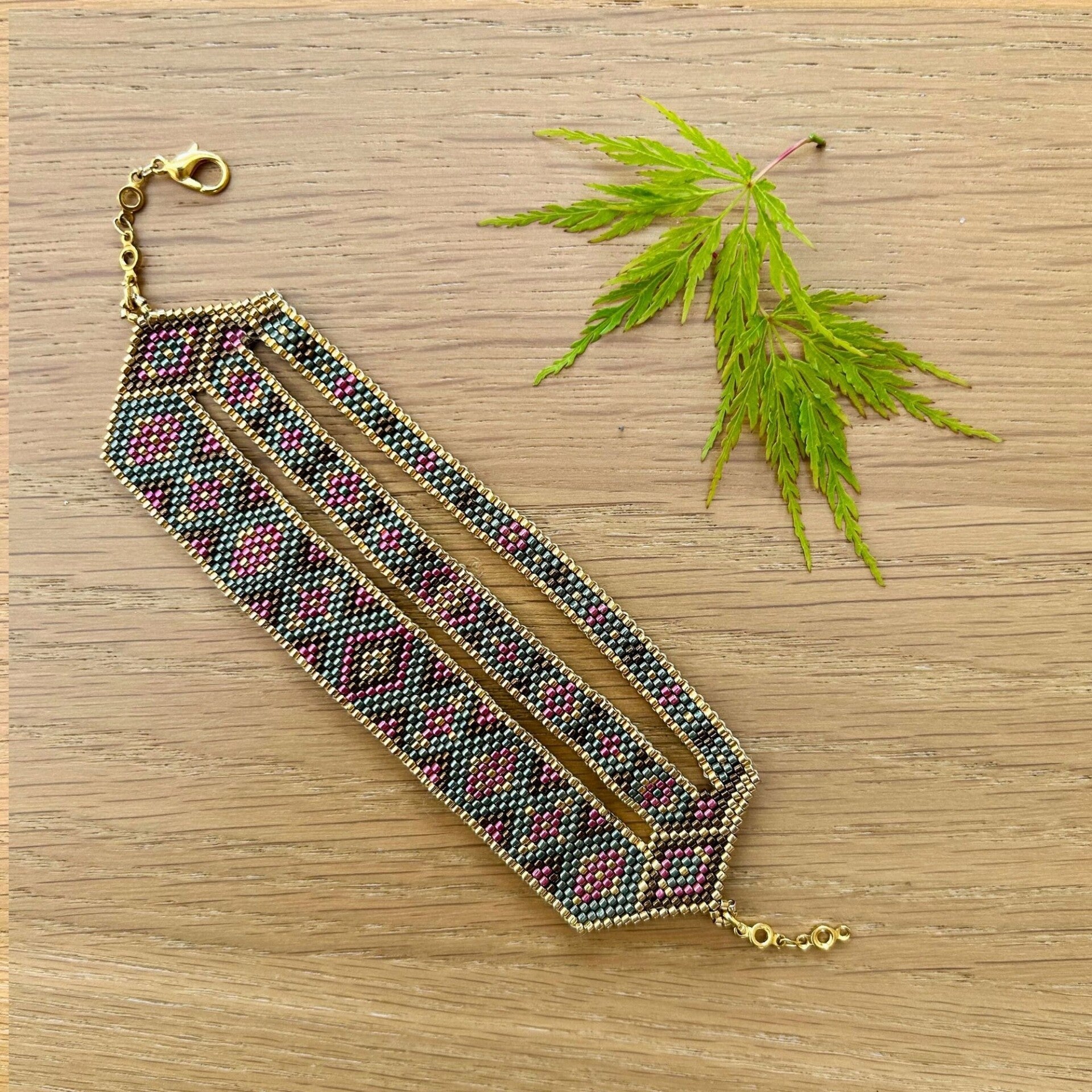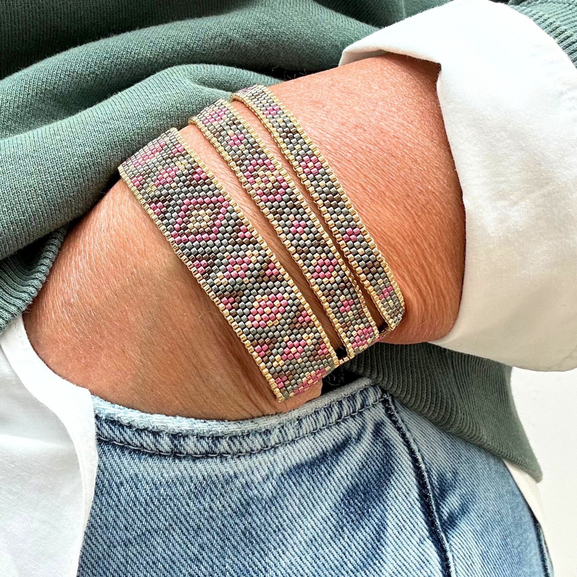 Cette manchette est composée de trois bracelets individuels, tissés séparément puis assemblés pour former une pièce unique. Chaque bracelet peut bien sûr être réalisé à l’unité, si vous souhaitez une version plus discrète.