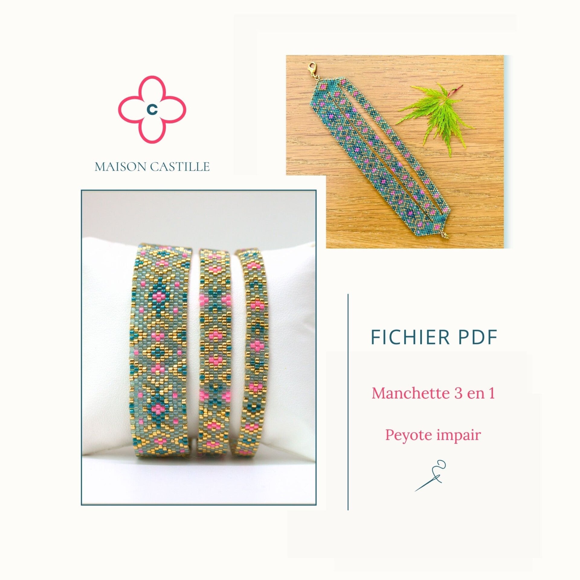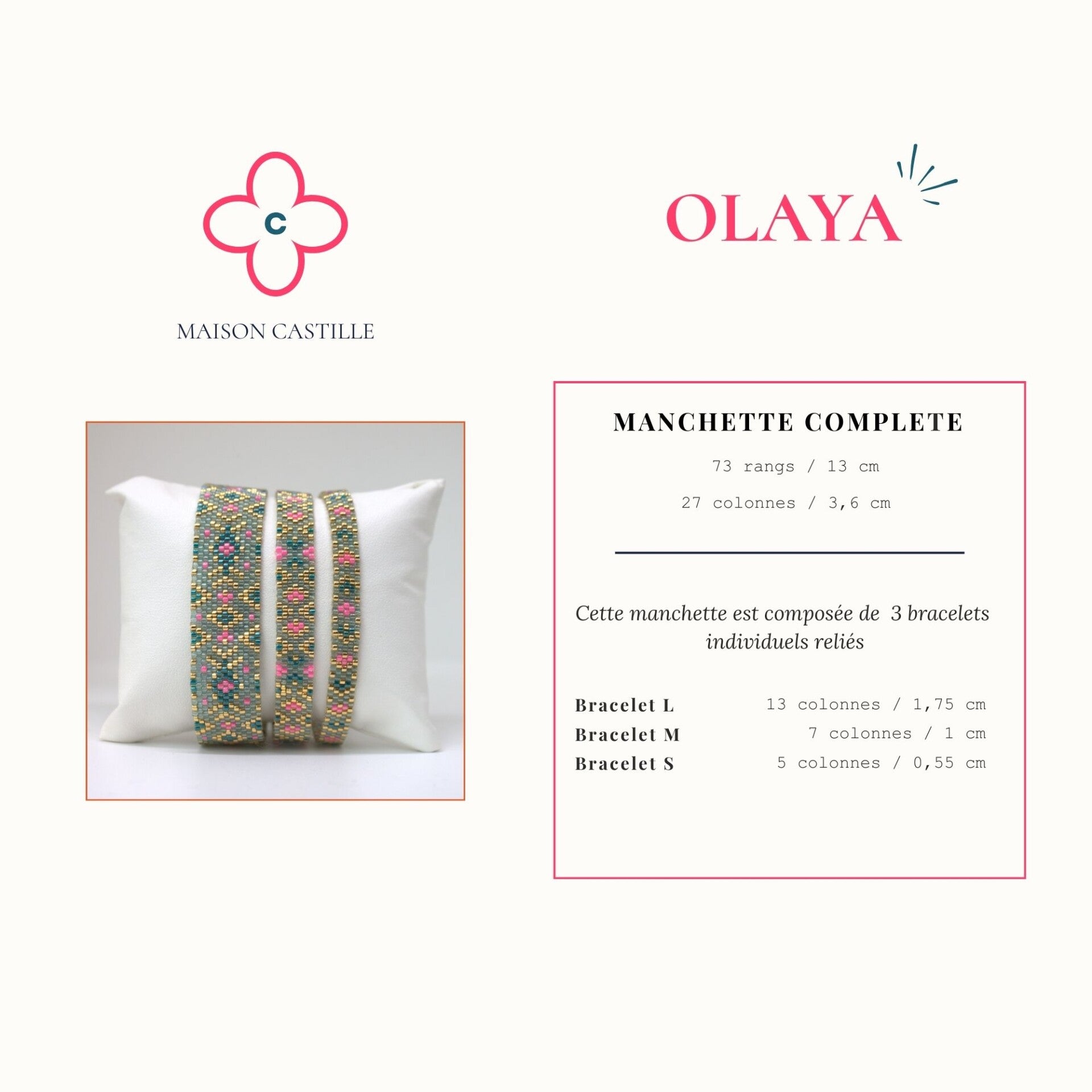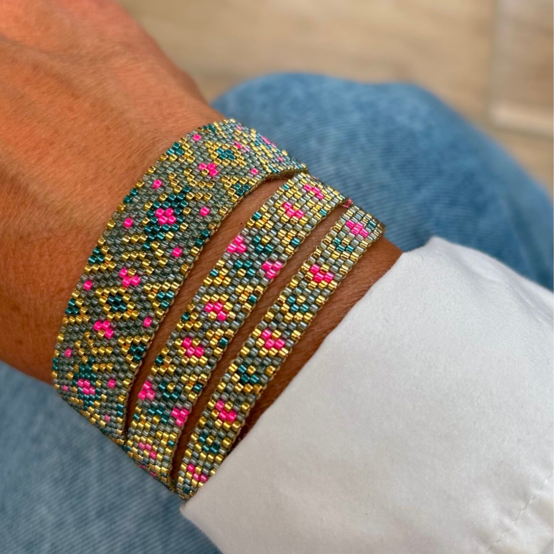 Cette manchette est composée de trois bracelets individuels, tissés séparément puis assemblés pour former une pièce unique. Chaque bracelet peut bien sûr être réalisé à l’unité, si vous souhaitez une version plus discrète.