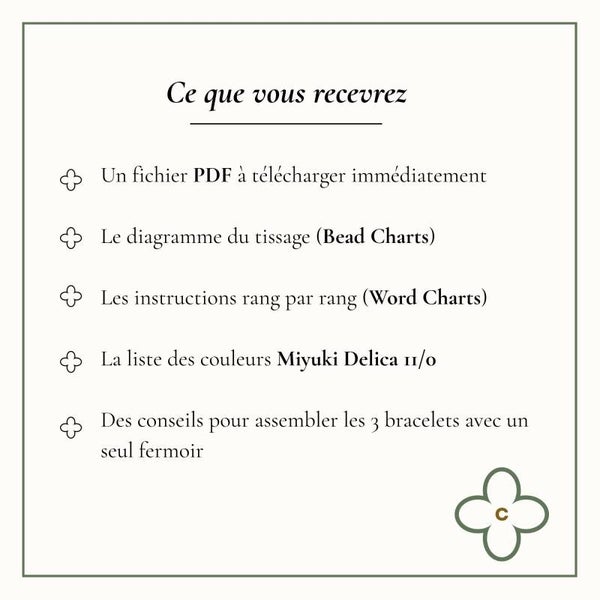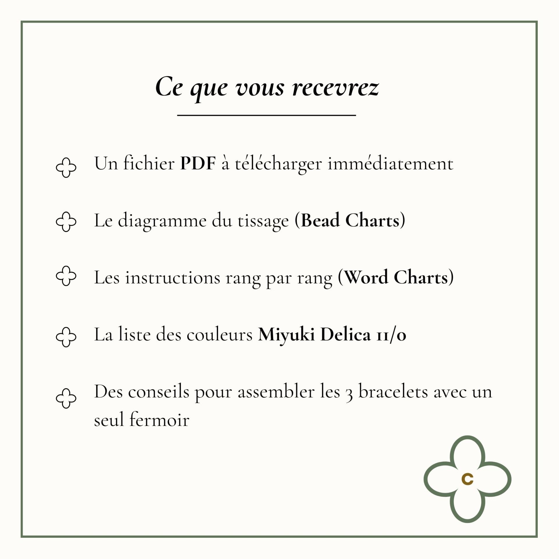 Cette manchette est composée de trois bracelets individuels, tissés séparément puis assemblés pour former une pièce unique. Chaque bracelet peut bien sûr être réalisé à l’unité, si vous souhaitez une version plus discrète.