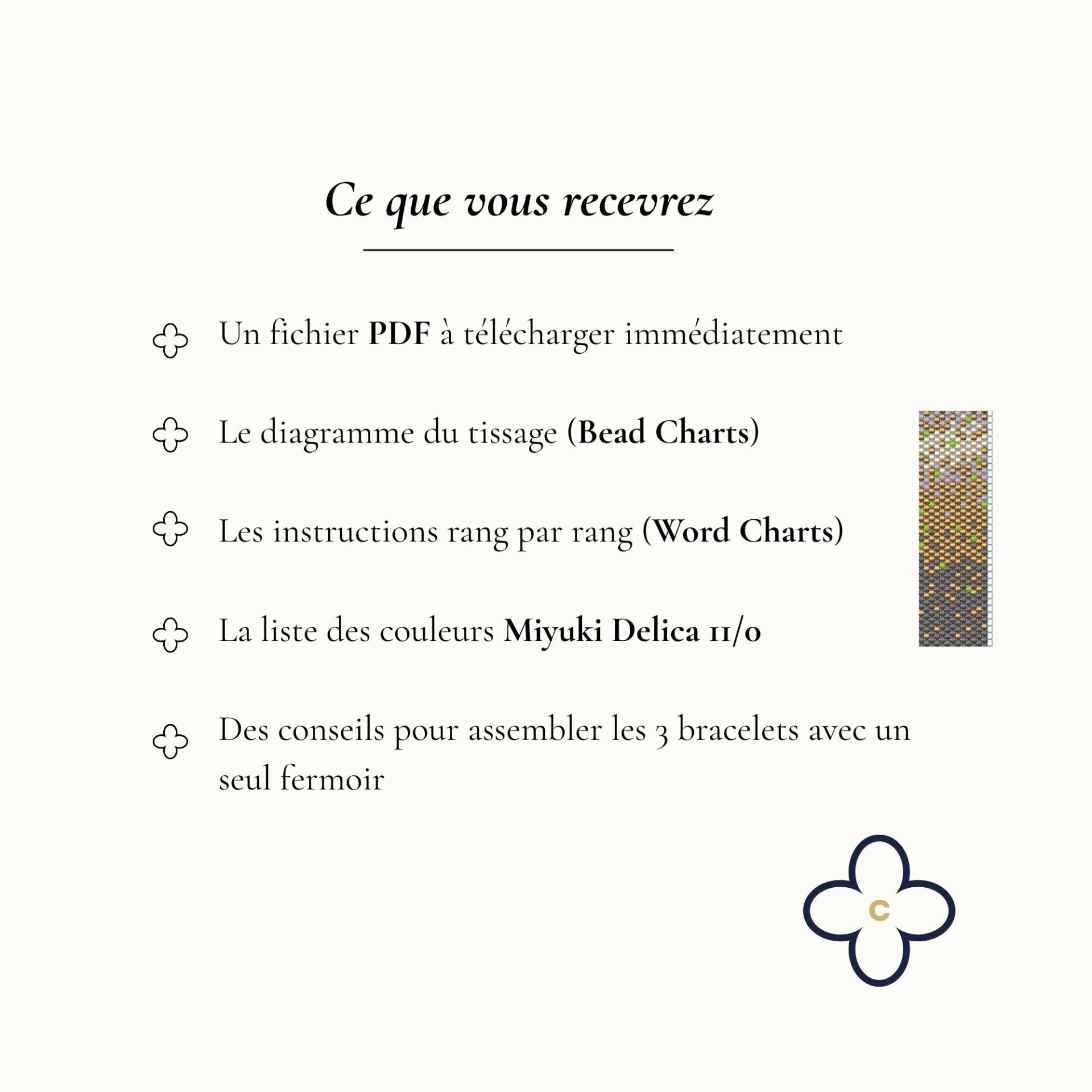 Cette manchette est composée de trois bracelets individuels, tissés séparément puis assemblés pour former une pièce unique. Chaque bracelet peut bien sûr être réalisé à l’unité, si vous souhaitez une version plus discrète.